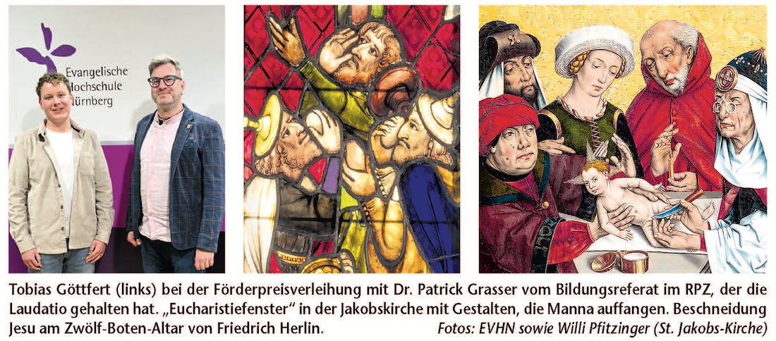 Ein Schlüsselwerk ist für den angehenden Religionspädagogen das sogenannte „Eucharistiefenster“. Es zeigt eine Szene aus dem Alten Testament: Gott versorgt das Volk Israel in der Wüste mit Manna, dem Brot vom Himmel – ein Motiv, das Christen als Vorausdeutung auf das Abendmahl verstehen. „So wird der alttestamentlichen Erzählung ein heilsgeschichtlicher Charakter zugeschrieben“, schreibt Göttfert. Die unbekannten Künstler hätten die Perikope, welche die jüdischen Wurzeln des Christentums erkennbar werden lässt, auch bewusst ausgliedern können.“ Doch sie entschieden sich dagegen – und gaben der Szene sogar ein fränkisches Lokalkolorit.