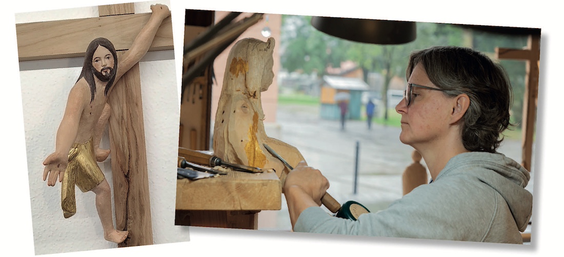 Geschnitztes Kruzifix von Marion Jochner und die Künstlerin. Fotos: Jochner/privat